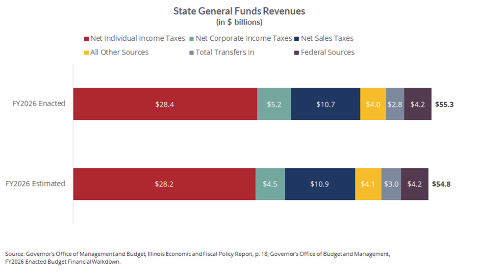 According to the Governor’s Office of Management and Budget’s (GOMB) October estimates, Illinois faces a modest but material general funds deficit of $267 million in the current fiscal year. Higher-than-expected expenditures on pensions and debt service slightly contribute to the gap, but revised revenue projections stemming from the impacts of H.R. 1 are the principal factor. Specifically, changes to the federal tax code and other corporate income tax changes will reduce income tax revenues by $981 million in FY2026. These factors have reduced expected general funds resources to $54.8 billion, down nearly $450 million, or 0.8%, from expected levels reflected in the balanced budget passed last year, despite better-than-expected sales tax revenues and other sources that increased revenues by $532 million.