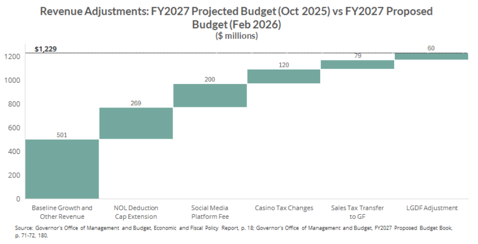 The proposal closes the $2.2 billion budget gap projected by the Governor’s Office in October 2025 primarily through a combination of targeted revenue changes, modest reallocations of existing revenues, and limited expenditure growth, rather than through large tax increases or deep spending reductions. Several of the budget-balancing measures involve temporary or incremental fiscal adjustments rather than permanent structural changes. These include extending limits on tax deductions, shifting revenues between funds, and adjusting the allocation of existing tax revenues.