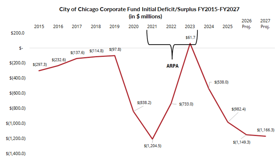 For more than 20 years, Chicago has operated under a structural budget deficit, meaning revenues have consistently been insufficient to keep pace with increasing expenditures, resulting in budget gaps.