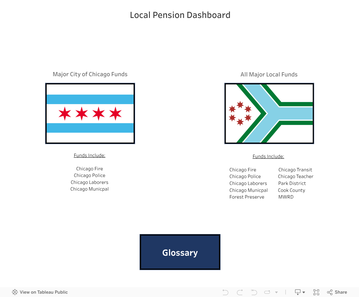 The dashboard groups the data into two different views: 1) The four City of Chicago pension funds; and 2) all 10 major local pension funds. Click on either of the two views via the flags below to see the pension metrics. From there, you can filter to select the specifics years and pension funds that you would like to view or compare. Click on the red boxes to navigate to other metrics or click on “Return to Dashboard Home” to return to the main screen.