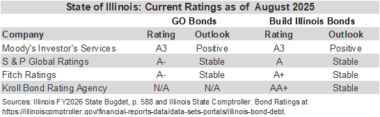 In October 2025, Moody’s Investors Services raised the State’s credit rating for general obligation and Build Illinois sales tax revenue bonds to A3, up from the previous rating of A2, with a stable outlook. The rating upgrade was due to the State’s increases in its reserves, the maintenance of balanced budgets, and continued improvement in the State’s financial management practices. Moody’s indicated a further upgrade could be possible if the State released its audited financial statements in a timely manner, further increased its reserves, and made additional pension contributions to reduce liability.